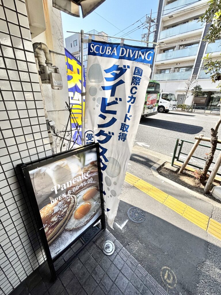正面に【加藤】と記載された看板が見えてきて、その先にスキューバダイビングの旗が見えてきます!🥞🤿