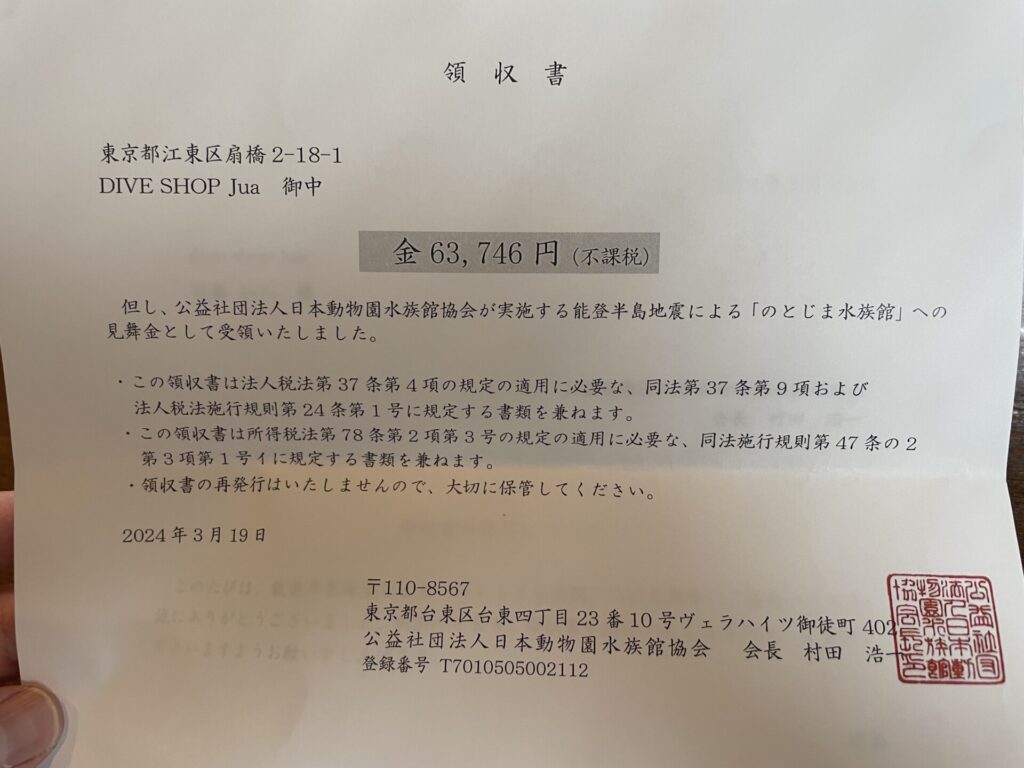 今回我々dive shop Juaでは、当店でダイビングを楽しんで頂いているメンバーの皆さまご協力のもと、『のとじま水族館』への復旧・復興に支援させて頂きました。