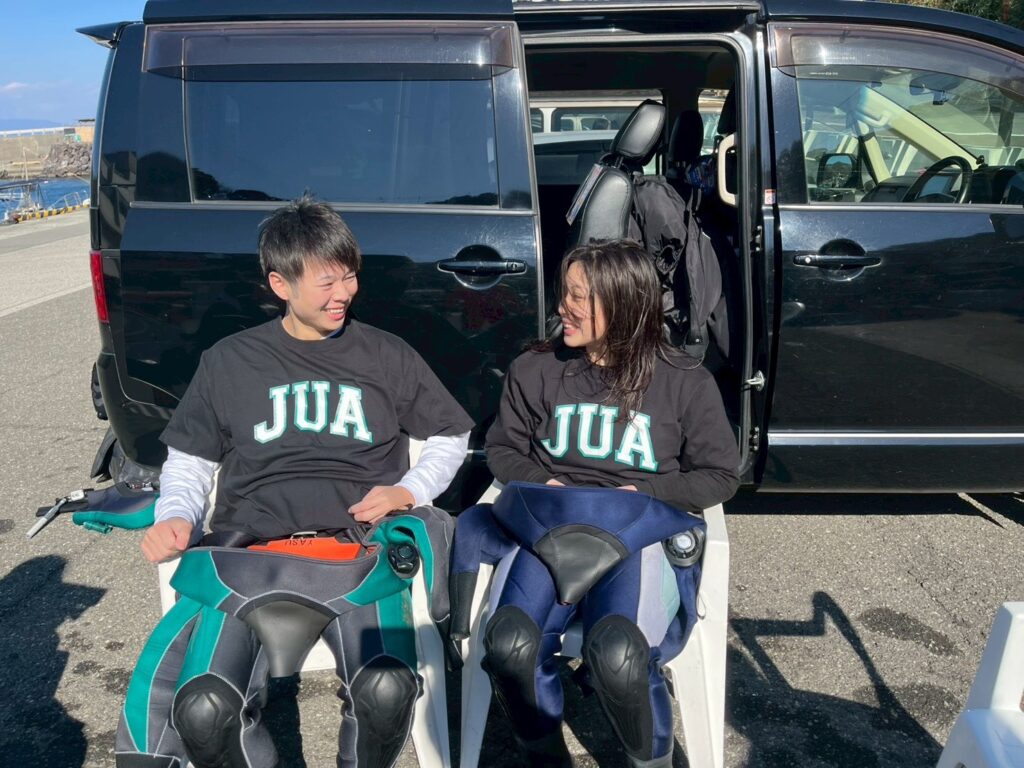ドライスーツを上半身だけ脱いで休憩中のお客様2人の談笑シーン。スーツの中に洋服を着て潜ります!