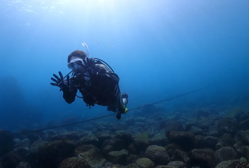 学科講習で学んだ事を海の中で実践していきます。たくさんの魚を見て楽しんだり海の中に差し込む太陽光の揺らめきを見て感動体験しつつ立派なダイバーになる練習をしていきましょう!