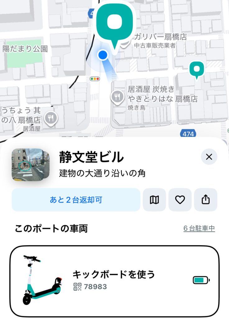 街中のポートからポートへ、電動キックボードや自転車で移動できるシェアサービスです。
